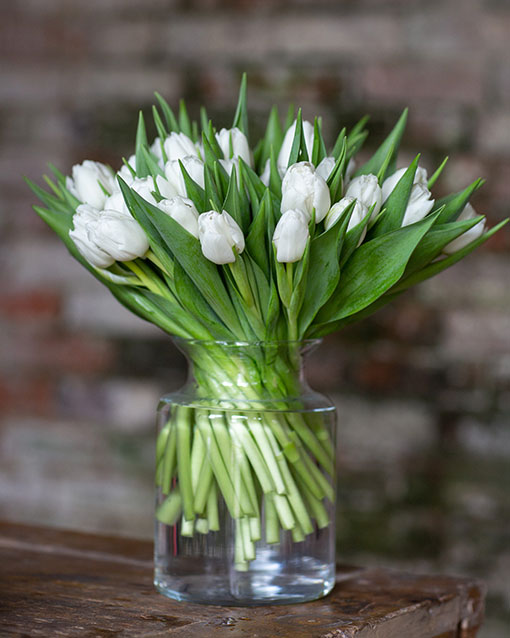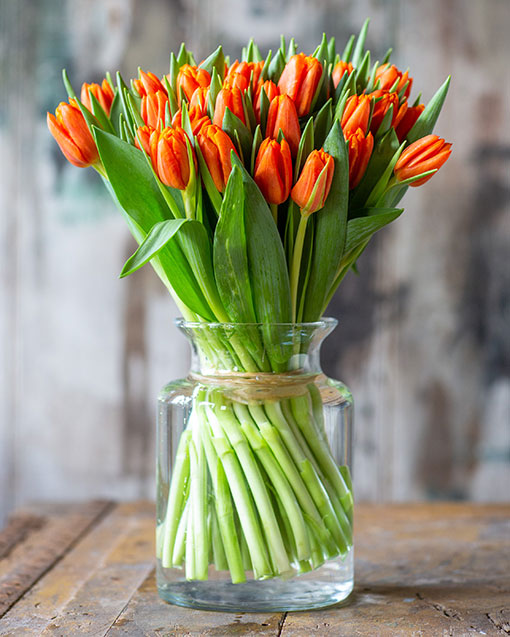 Tulips bring a smile to everyone’s face. A bright and cheery flower that always keeps on growing. The petals of the double tulips and parrot tulips are exceptionally beautiful. A great arrangement to have in the kitchen or drawing room.